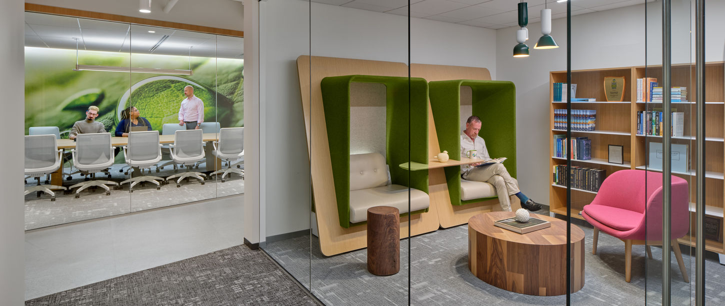 “We emphasized blue and green, which were taken right from their logo,” said Currie, “They also happen to be the two most commonly seen colors in nature.” Private offices and focus rooms have colors that are also part of the branding package with the added benefit of being good for people with color blindness.